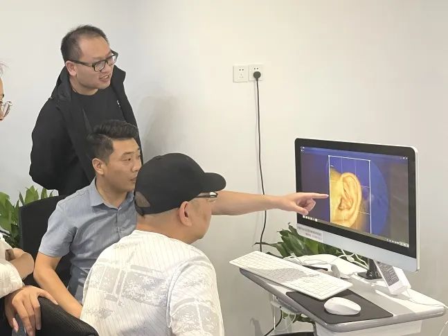 不同于常規(guī)的體檢,中醫(yī)耳穴診療只需要一支耳穴檢測筆、一臺電腦就可以操作了。耳穴檢測操作師李東飛老師在員工手腕部貼上導聯(lián)電極,并通過對兩只耳朵的耳像采集,同時輸入相應參數(shù),即可在電腦上生成該員工的“耳穴檢測報告”。耳穴檢測完成后,診療師再根據(jù)耳穴檢測報告,實施“耳穴貼壓治療”方案。耳穴貼壓前,員工們先享受了一輪耳廓按摩服務。你可別小瞧這按摩,除了能帶來舒適的按摩體驗感,其最大目的是調(diào)動耳廓的氣血,讓貼壓效果更好。